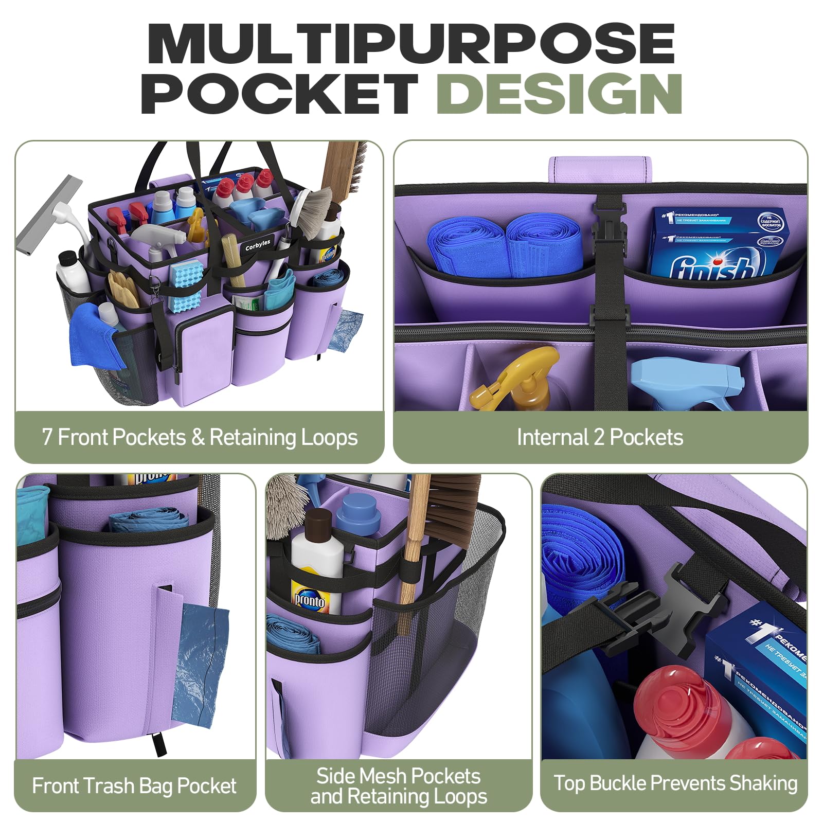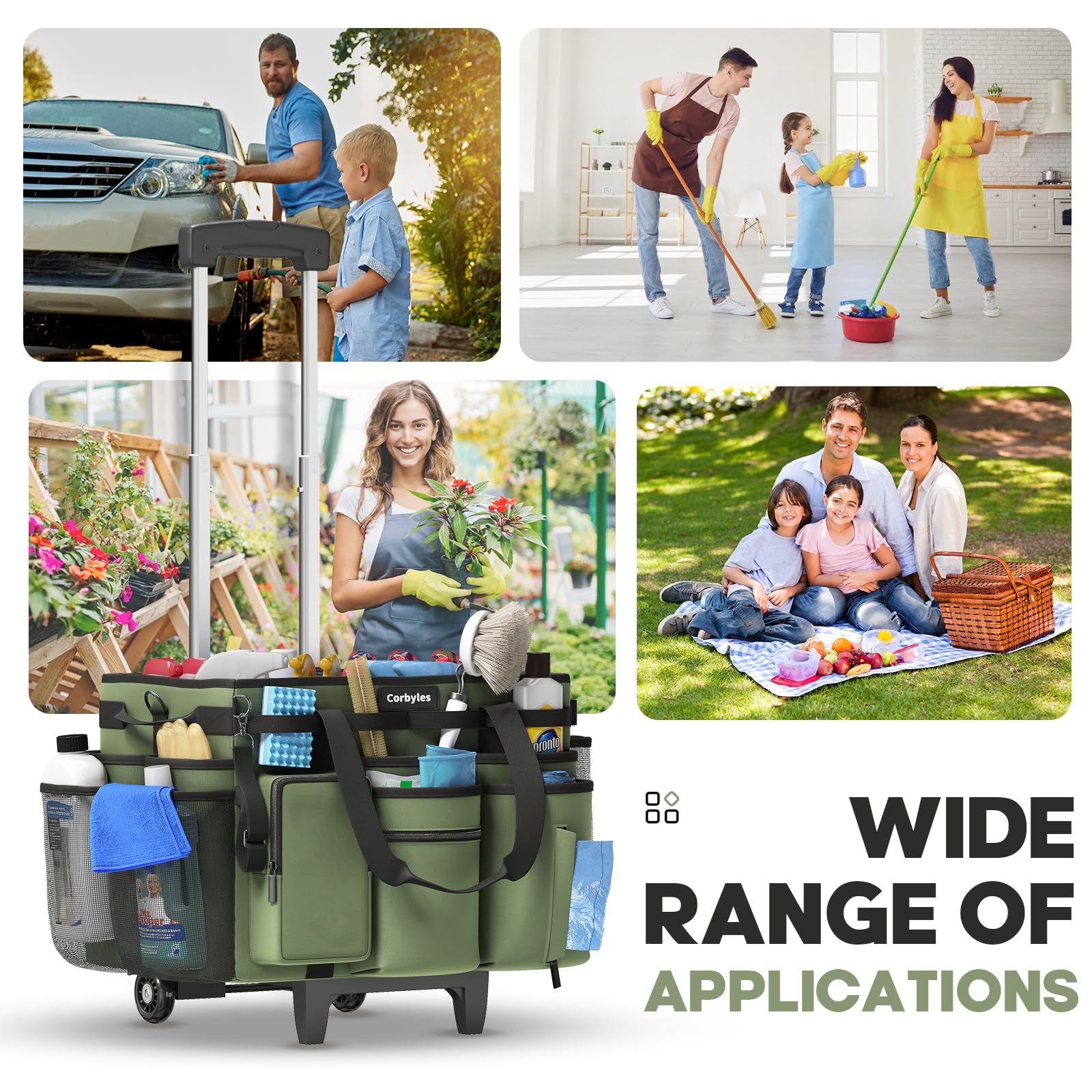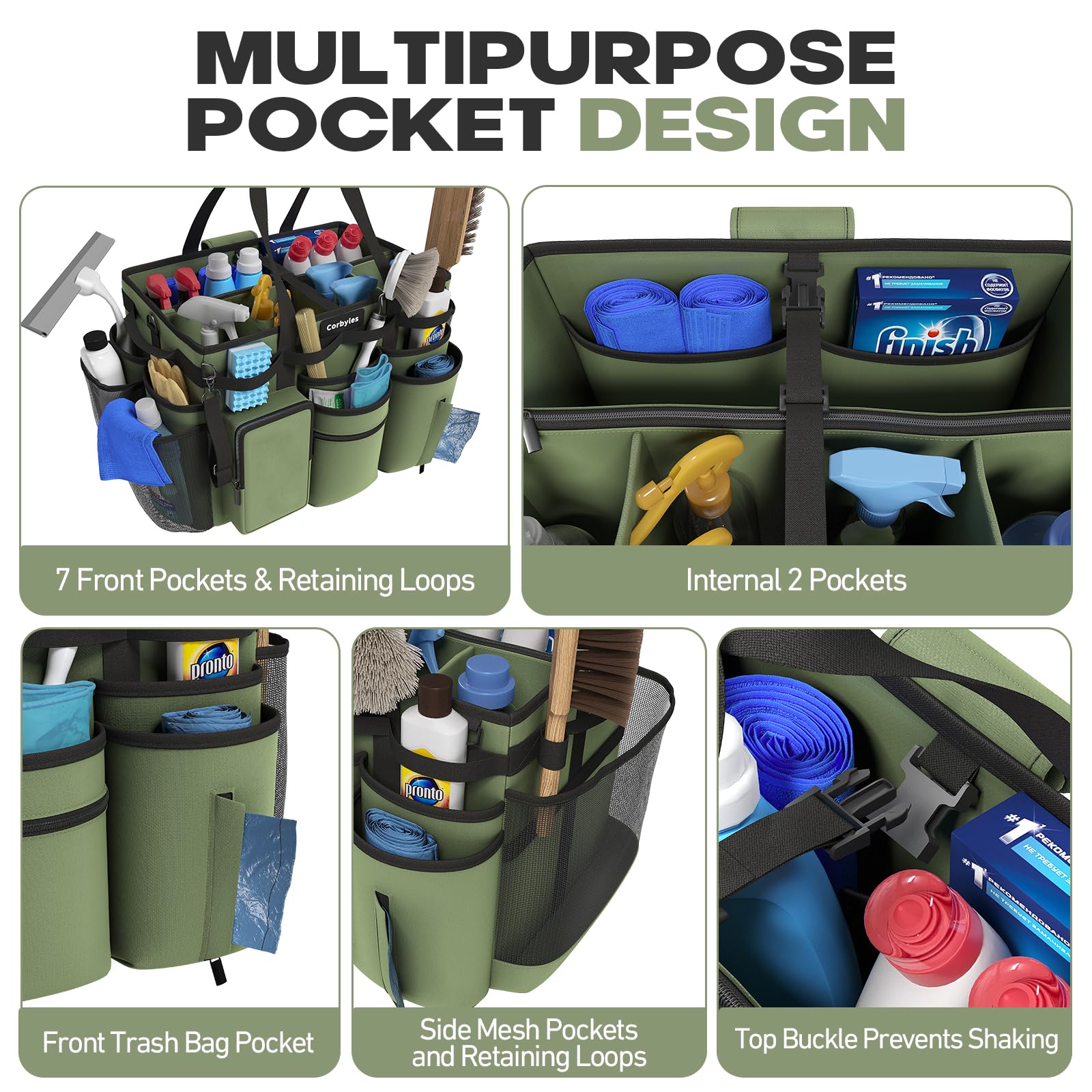 - Waterproof & Easy to Clean: Corbyles rolling cleaning caddy is made of 900D Oxford fabric with a PVC coating for waterproofing and durability. The cleaning supplies organizer has two reinforced support panels sewn to the front and back to keep the bag in shape. The bottom has a removable aluminum foil liner for easy cleaning. Safety clasp at the top prevents items from falling out when filled with cleaning supplies.