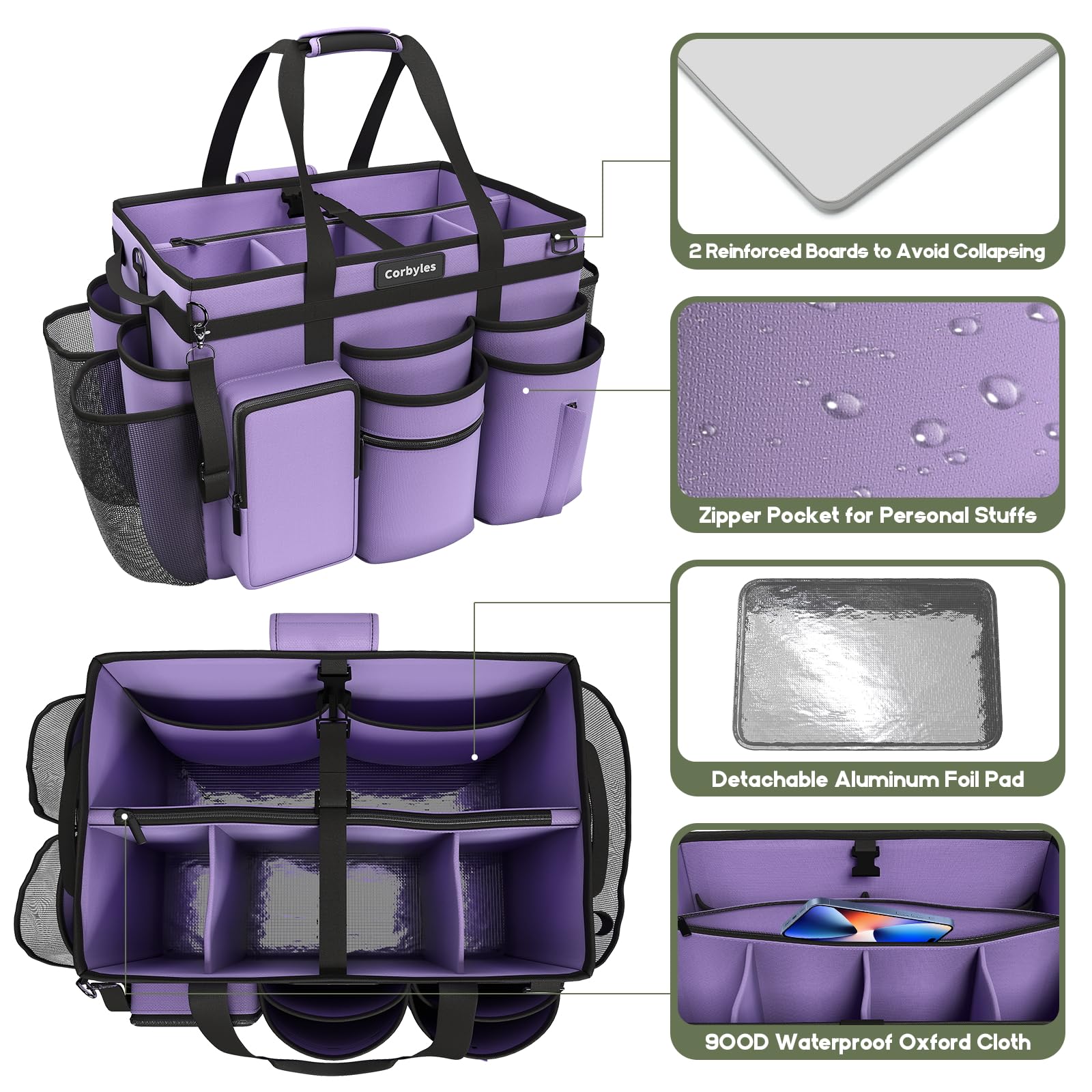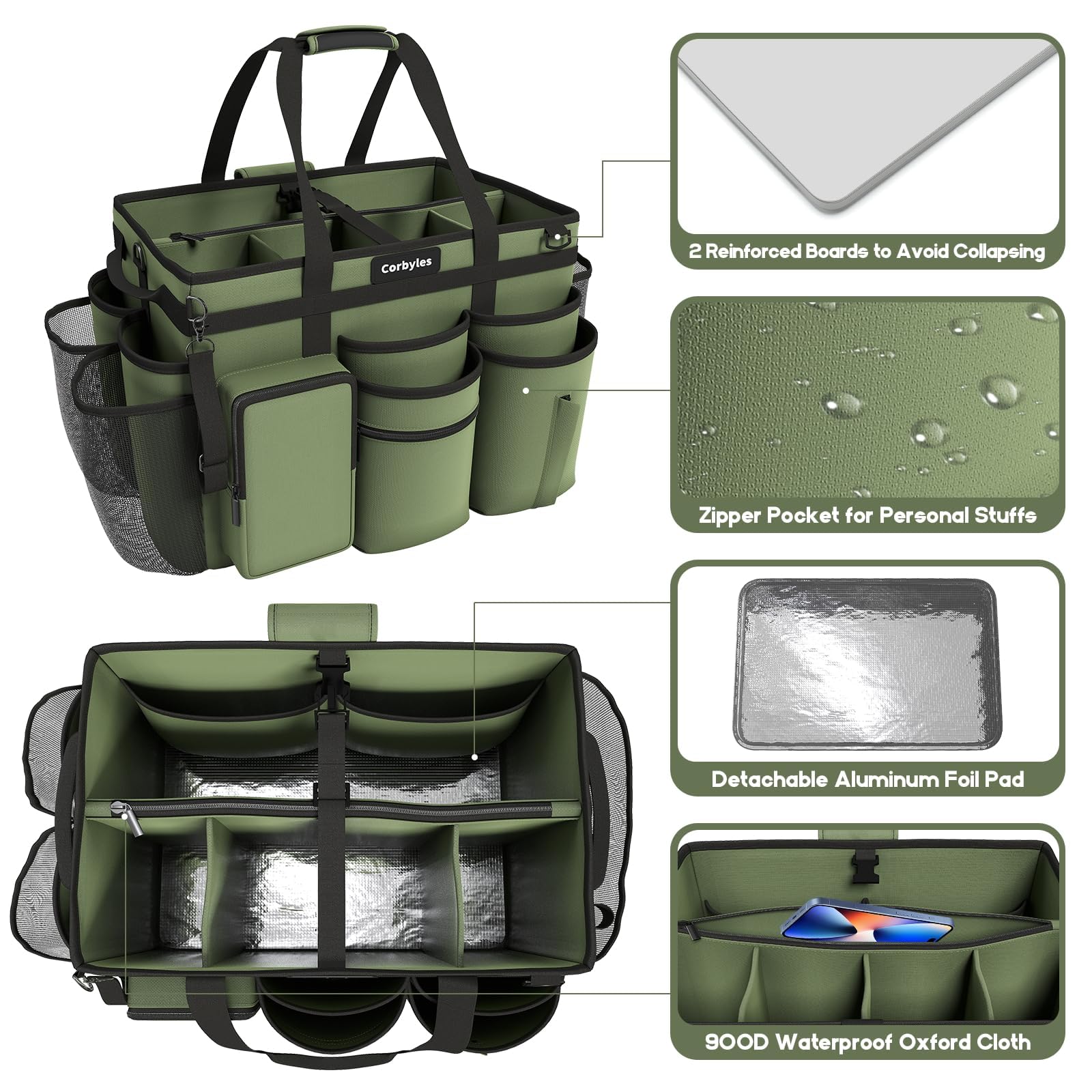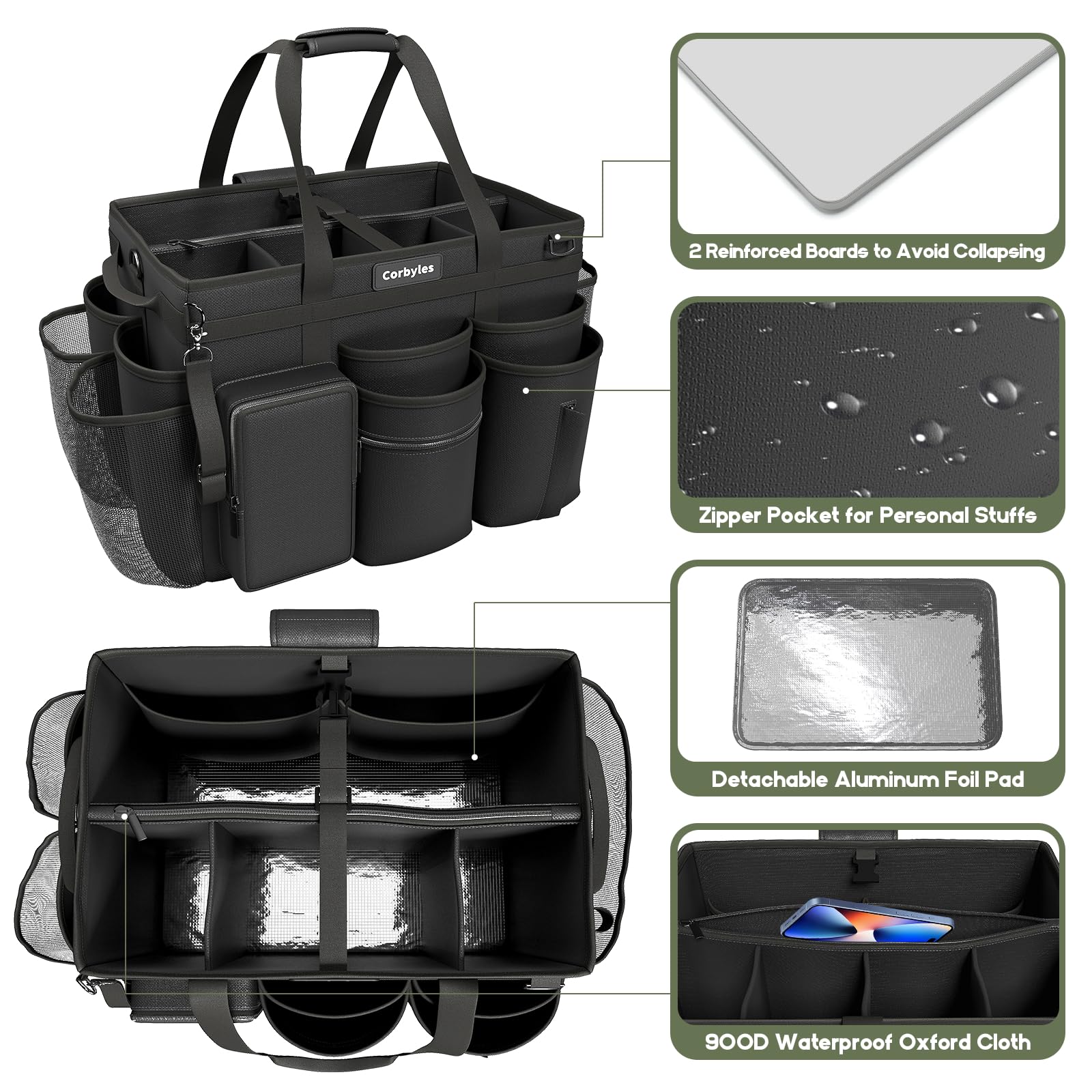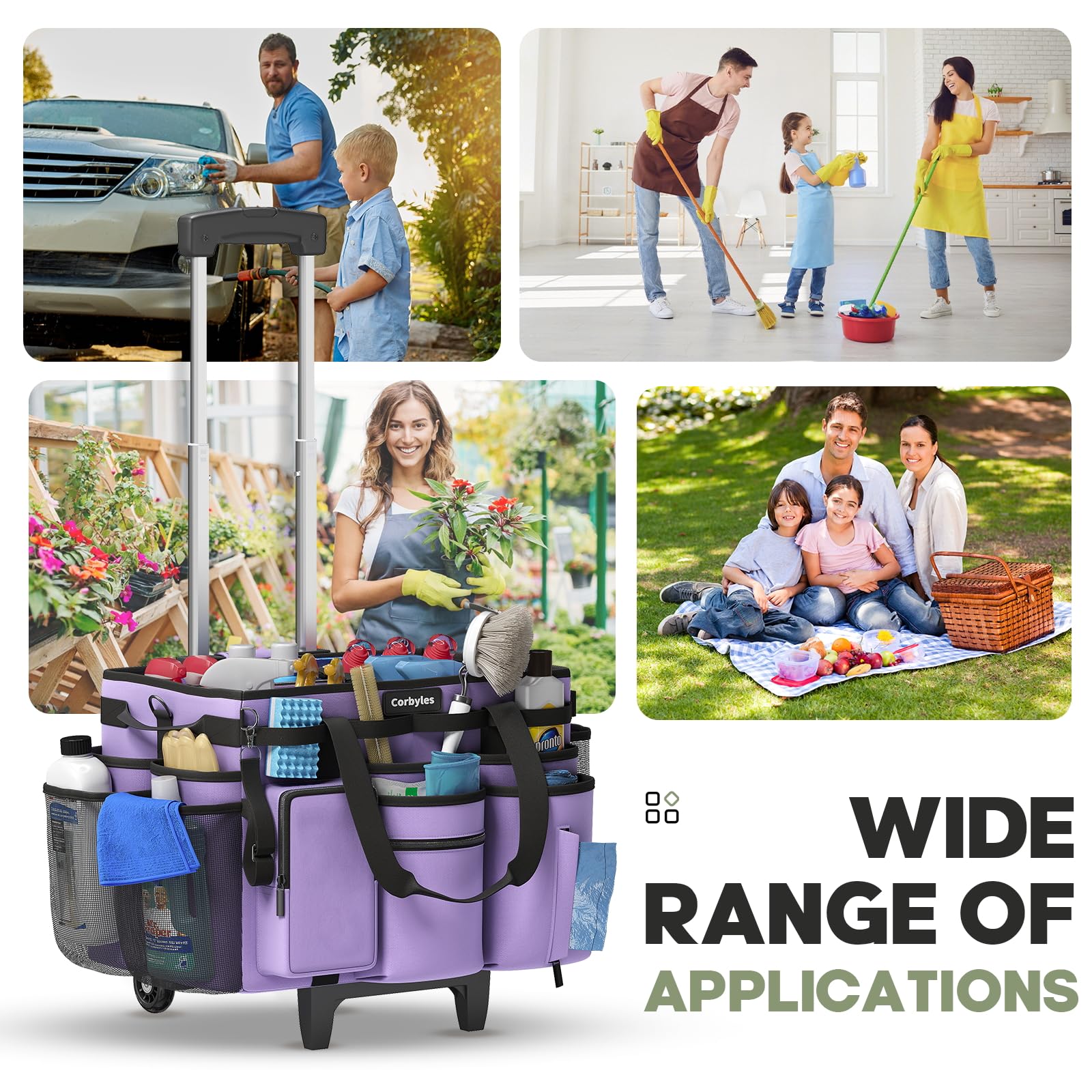 - Waterproof & Easy to Clean: Corbyles rolling cleaning caddy is made of 900D Oxford fabric with a PVC coating for waterproofing and durability. The cleaning supplies organizer has two reinforced support panels sewn to the front and back to keep the bag in shape. The bottom has a removable aluminum foil liner for easy cleaning. Safety clasp at the top prevents items from falling out when filled with cleaning supplies.