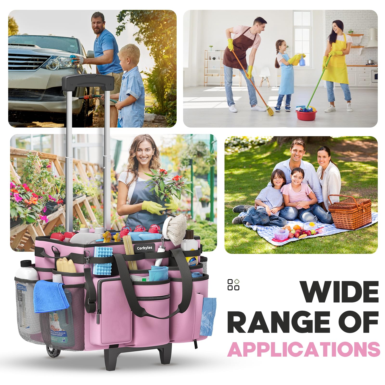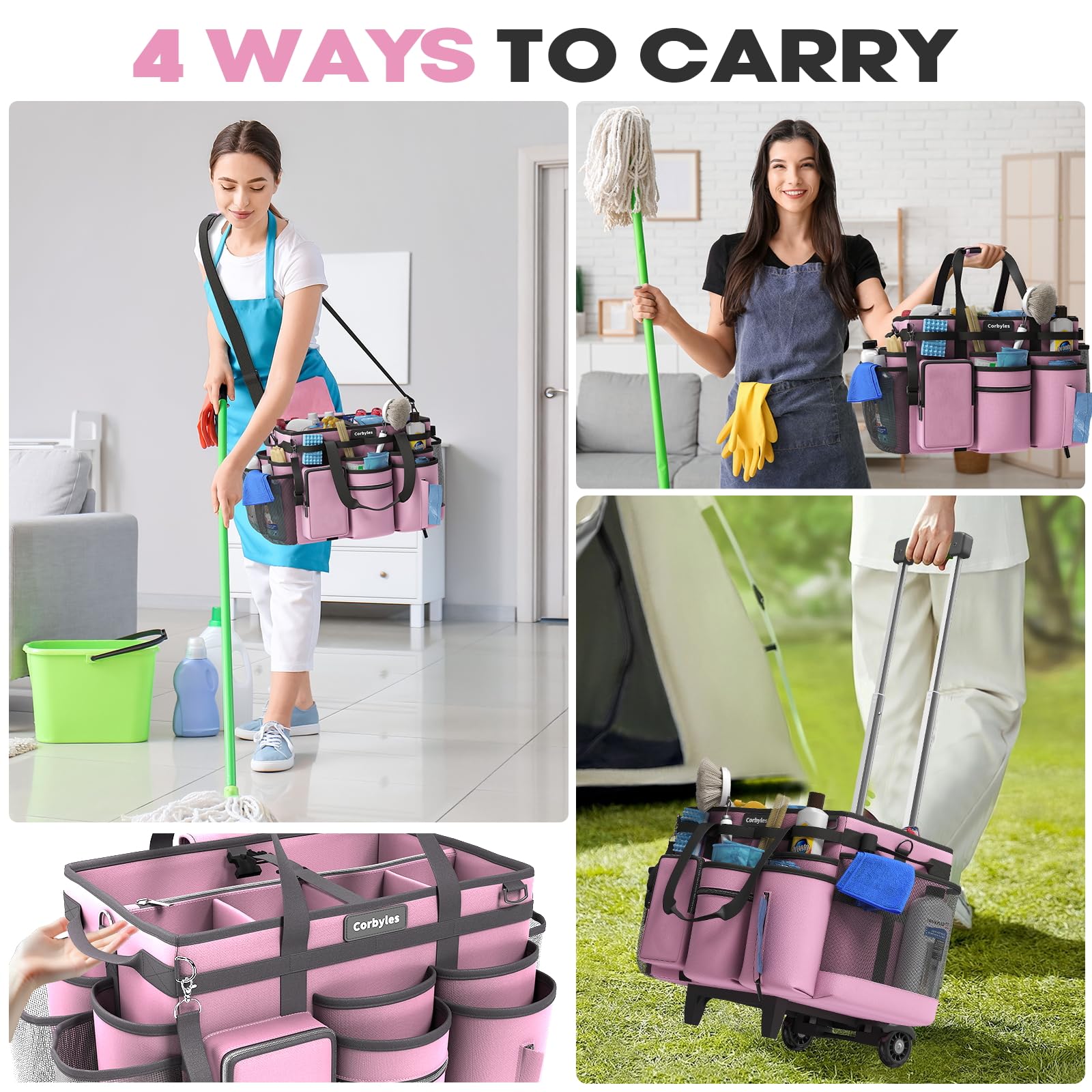 Rolling Cleaning Caddy Bag with Detachable Trolley, Cleaning Supplies Organizer Cart on Wheels, Cleaning Supply Caddy for Housekeepers, Large Professional Detailing Bag Tote for Home, Car (Pink)