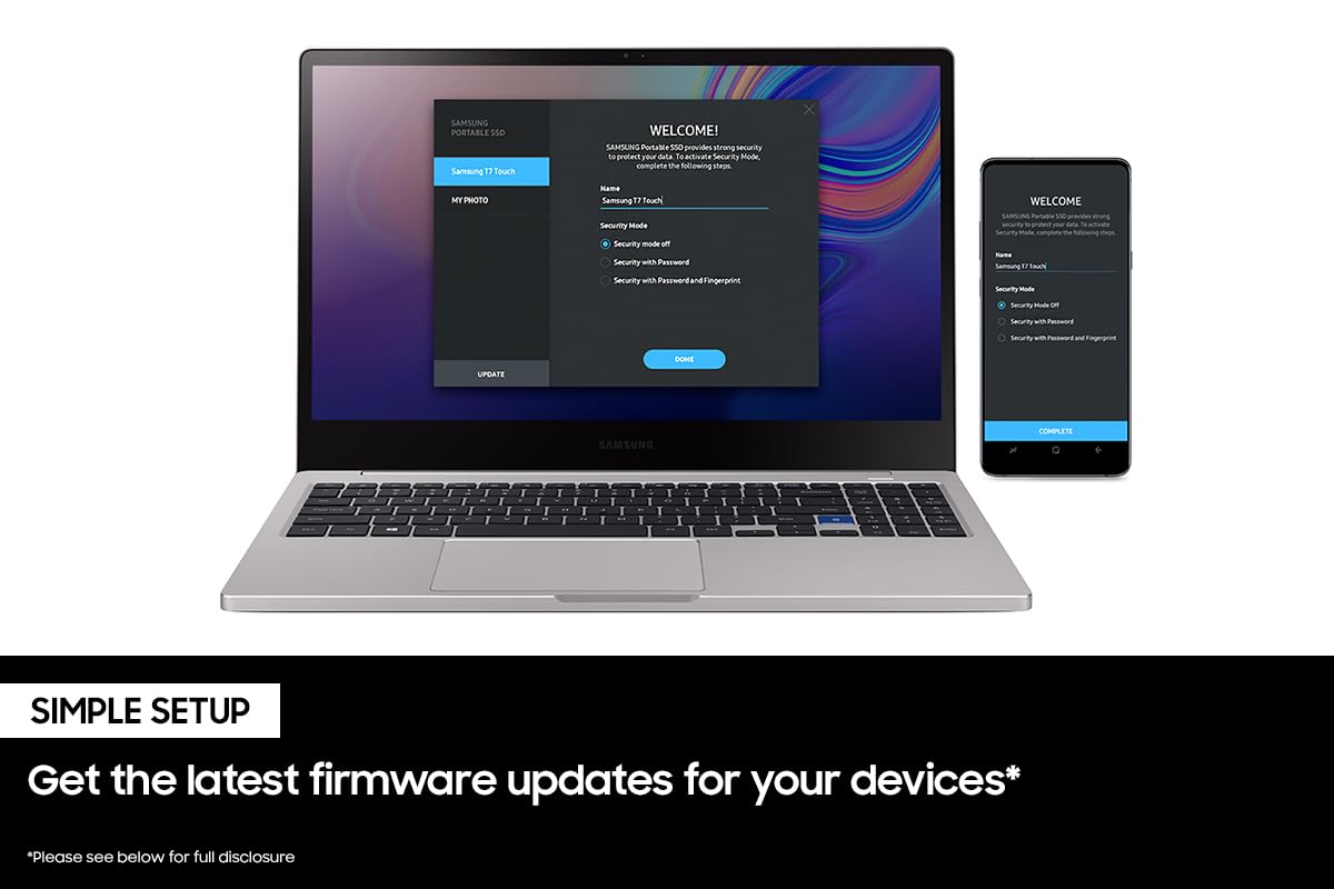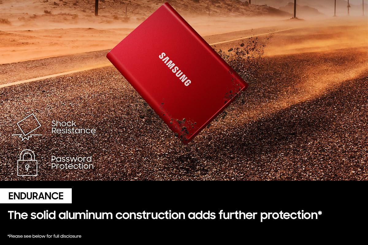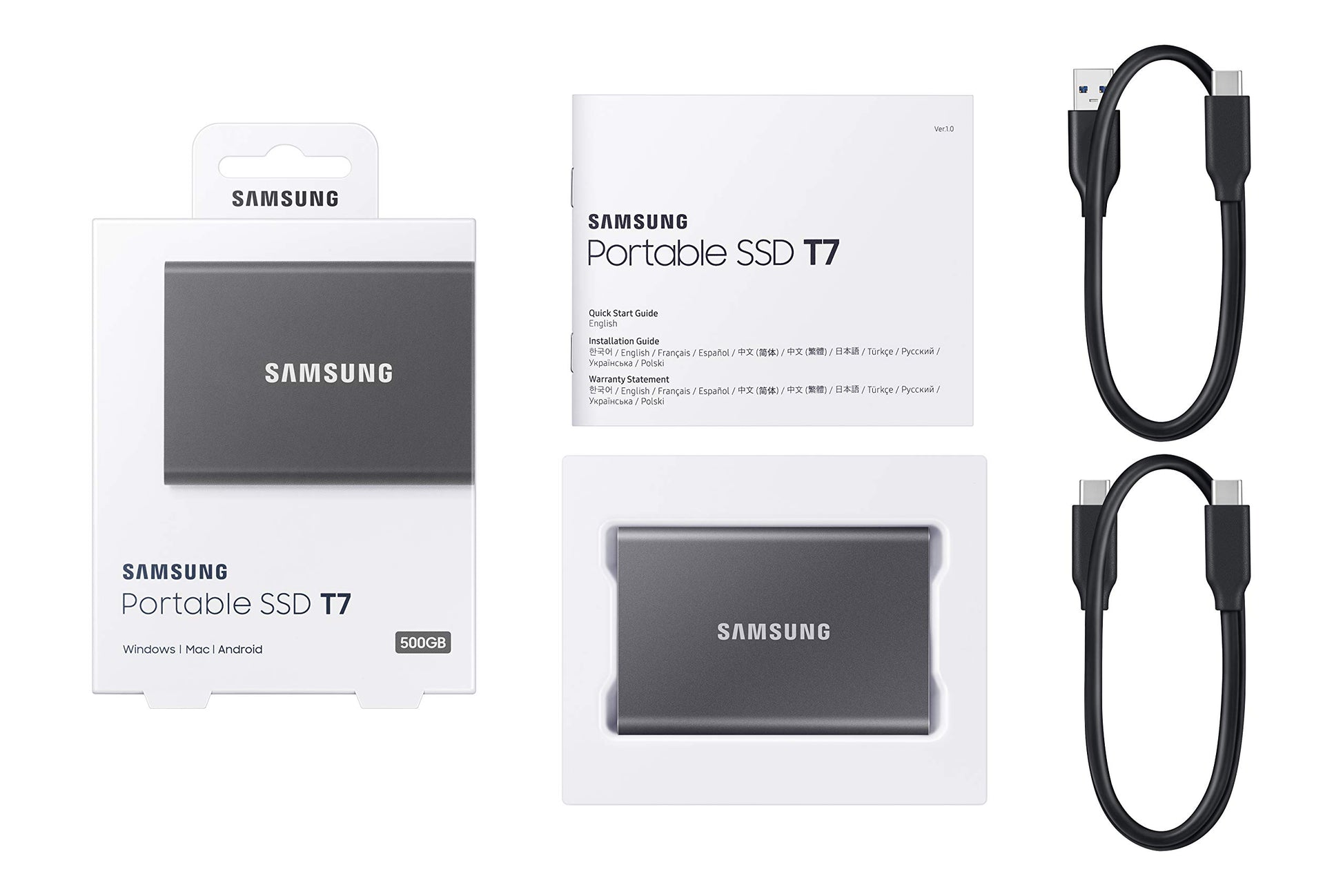 The Samsung Portable SSD T7 is the next standard in external storage. With transfer rates up to 9.5x faster than traditional external hard drives and read/ write speeds up to 1050 MB/s, you can move massive files around with unparalleled ease and fluidity. Its sleek, shock-resistant design is uncommonly durable, capable of withstanding drops from up to 6ft, so you can take it on-the-go with complete peace of mind. The T7 is compatible with PC, Mac, Android devices, gaming consoles, and more*******. Included in the box are USB Type C-to-C and Type C-to-A cables for added convenience. All firmware and components, including Samsung's world-renowned DRAM and NAND, are produced in-house, allowing end-to-end integration for quality you can trust.******** *Performance may vary depending on host configuration. To reach maximum read/write speeds of up to 1,050/1,000 MB/s, respectively, the host device and connection cables must support USB 3.2Gen 2 and the UASP mode must be enabled. **Based on internal test results compared to a Samsung external HDD 1TB (HX-MTD10EA). Test system configuration: ASUS Z370 ROG MAXIMUS X APEX (USB 3.2 Gen 2 Type-C), Intel Core i7-8700K CPU @ 3.70GHz(Coffeelake), OS-Windows 10 RS6. ***Based on an internal free fall shock test conducted under controlled conditions. ****For more information on the warranty, please visit www.samsung.com/us/support/warranty/. *****According to the Samsung internal quality standards for heat management and safety, T7 maintains its outer casing temperature below 118.4o F, except when the ambient temperature is above 118.4 F. ******Software requires Windows 7 and higher, Mac OS X 10.10 and higher, or Android 5.1 (Lollipop) and higher. Older versions of the Windows, Mac, and Android operating systems may not be supported. Firmware update requires PC or Mac and internet connection. Android app available on Google Play. *******Compatibility with host devices may vary. Some operating systems may require T7 Touch reformatting. Please find the compatible devices list on Samsung.com/support. T7 Touch is compatible with USB 3.0 and USB 2.0. ********Source: 2003-Q3 2020 IHS Markit data: NAND suppliers' revenue market share.